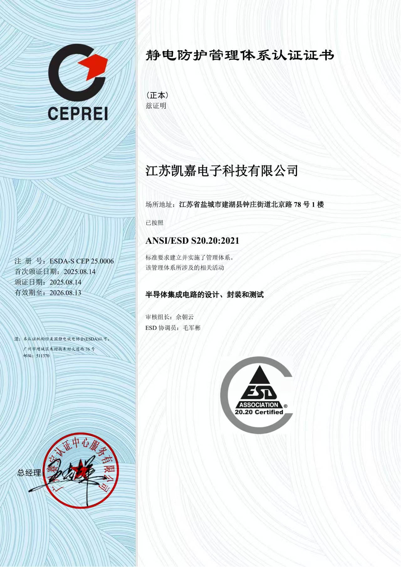 凯嘉科技通过ESD S20.20静电防护管理体系认证